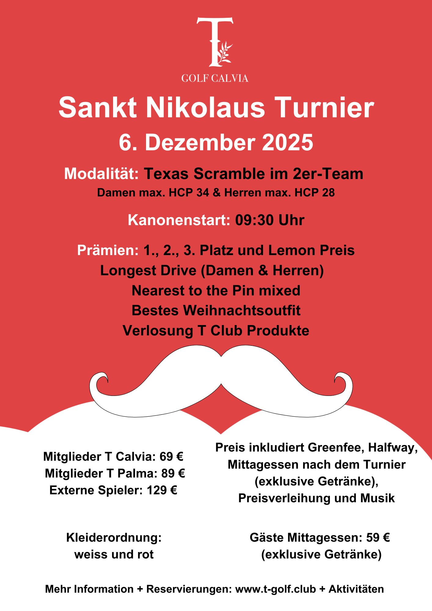 Am 6. Dezember 2025 steigt unser traditionelles Sankt Nikolaus Turnier im T Golf Calvia. Starten Sie mit uns festlich in die Adventszeit!