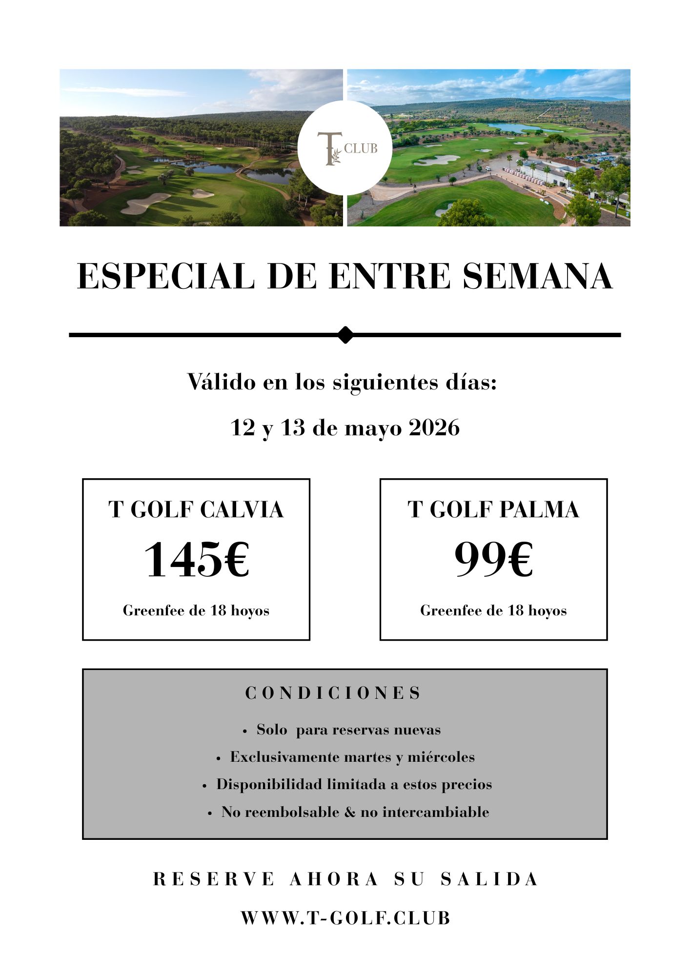 Juegue en ambos campos a una tarifa especial entre semana. El 12 y 13 de mayo de 2026, el T Club ofrece tarifas exclusivas de greenfee en T Golf Calvià y T Golf Palma.